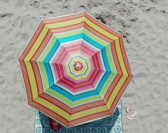 The Beach Umbrella will be keep you cool in style this summer.features an aluminum pole and fiberglass ribs operated by our Push & Pop Mechanism.