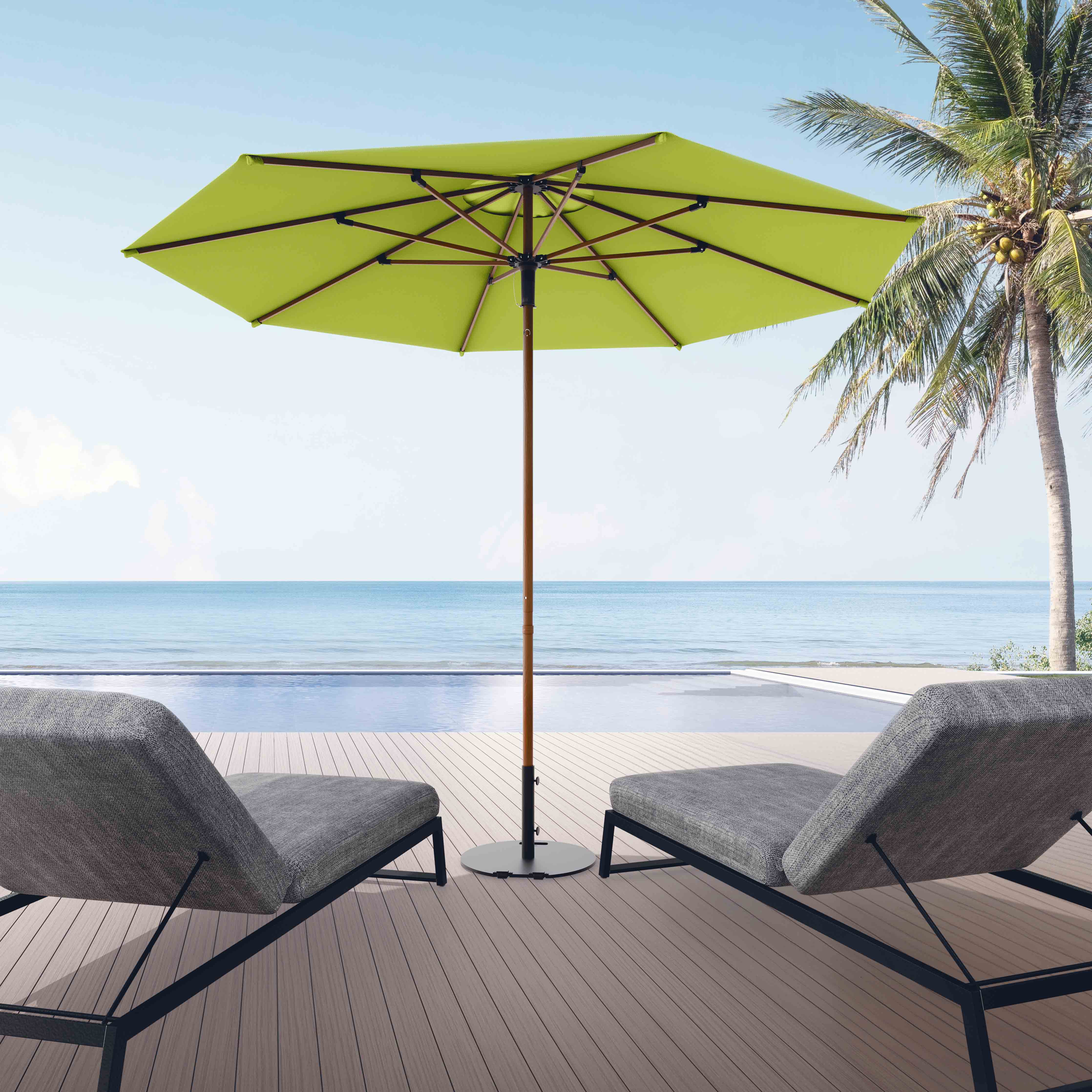 The Wooden™ market umbrella opens just like your regular rain umbrella, except it's a lot sturdier. Made from thick, high-grade aluminum, this umbrella will withstand weather and time. In addition, its unique wood grain finish will fit perfectly in any outdoor space.